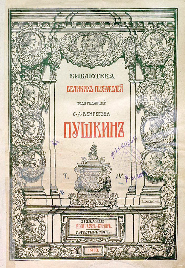 «Больше всего было книг. Они … голубели Пушкиным и багровели Гоголем, они плотно слежались компактными томами Тургенева в издании Стасюлевича, они бурели Боборыкиным и коробились Горбуновым… зелёная бронза Брокгауза и Ефрона опрятно сияла за пыльным зеркальным стеклом книжного шкафа...»