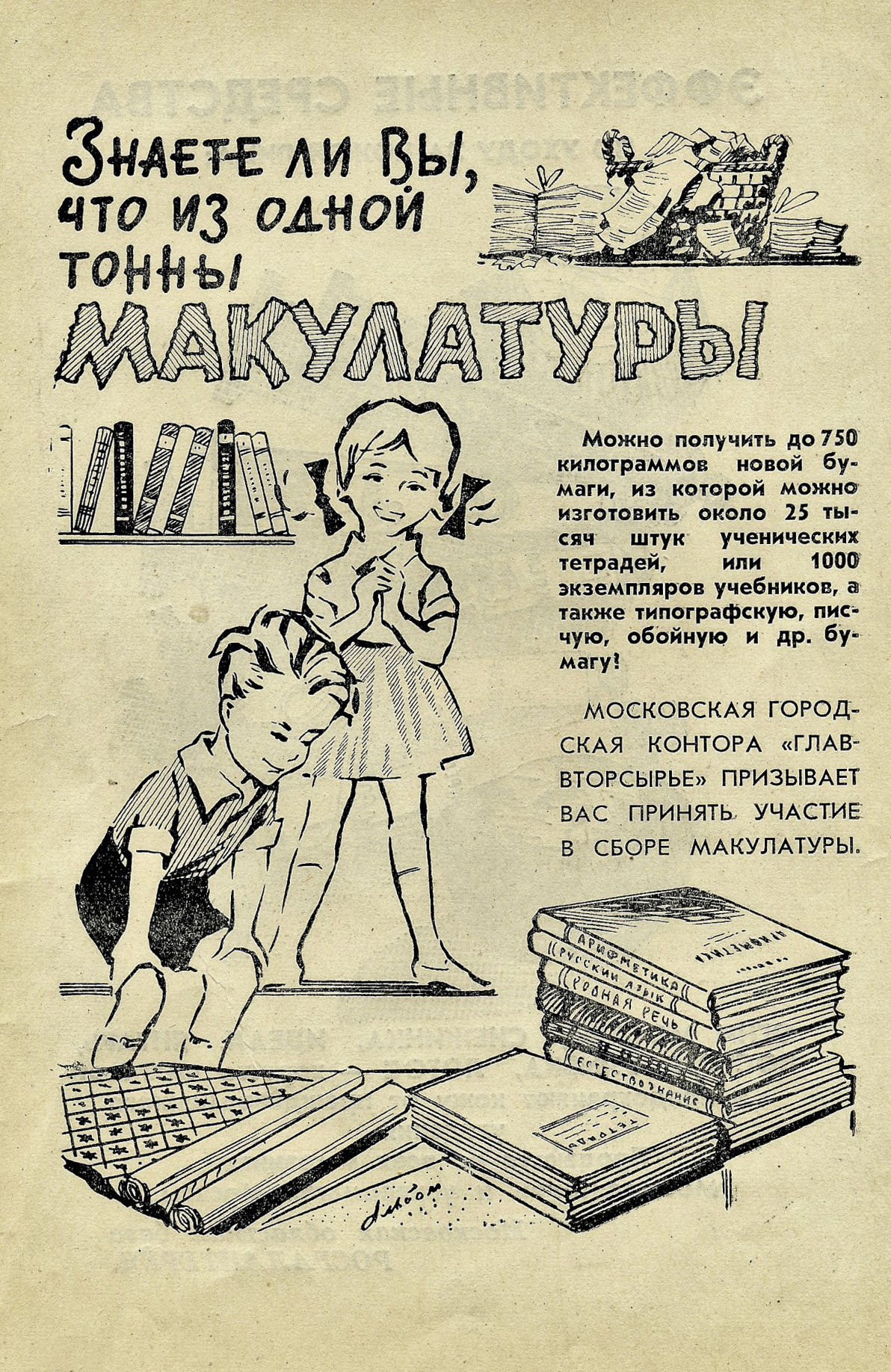 Рекламная листовка Московской городской конторы «Главвторсырье». Призыв к сбору макулатуры. 1963
