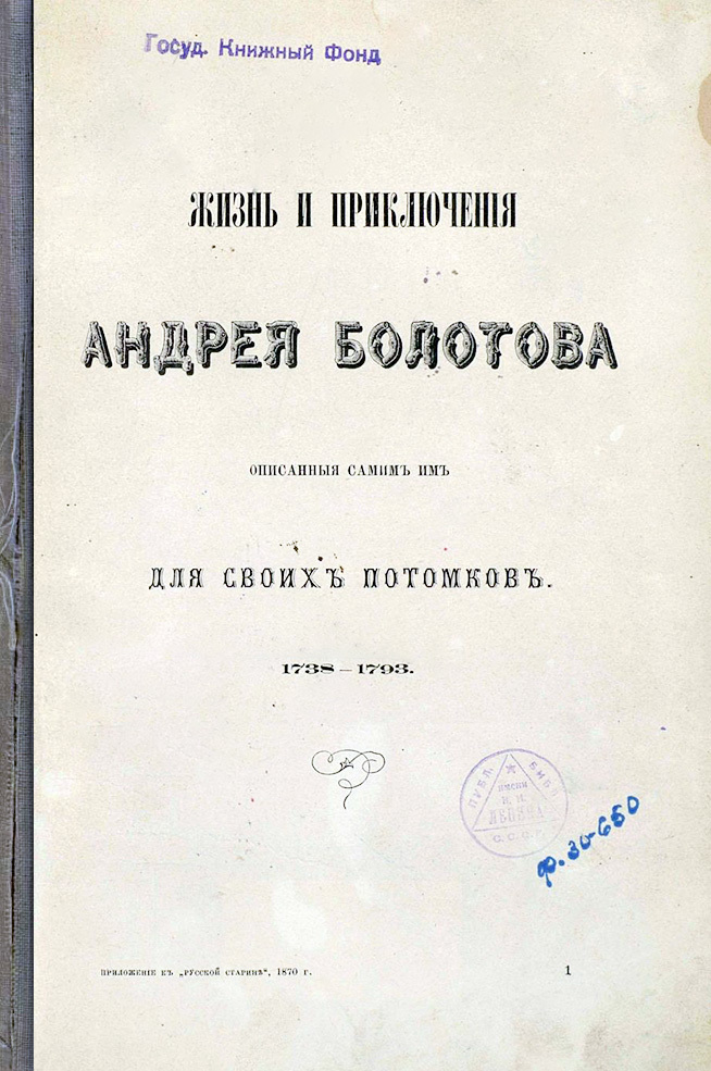 Жизнь и приключения Андрея Болотова, описанные самим им для своих потомков, 1738−1793